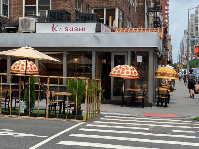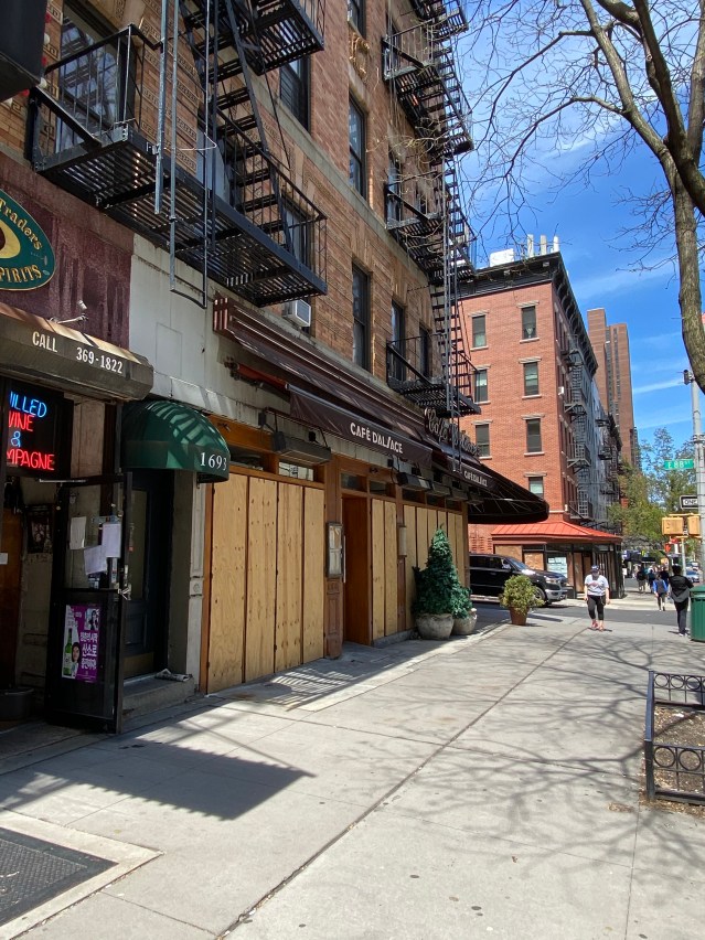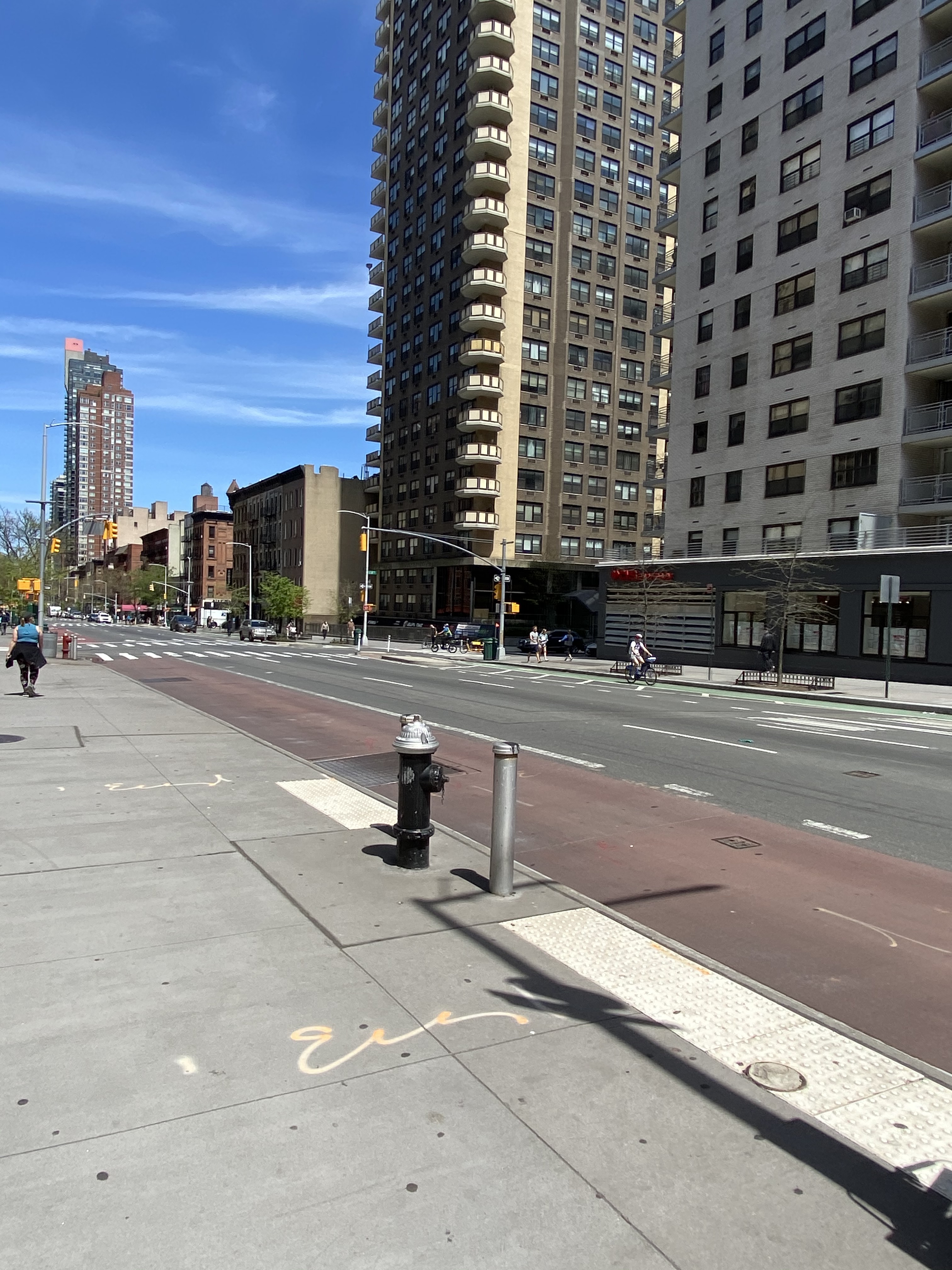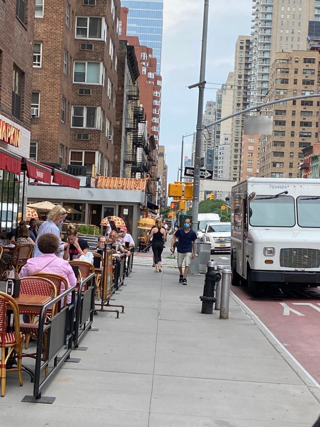 There are visible signs that things are “different” now. People give you a wide berth instead of elbowing you without a second glance. Occasionally someone loudly and angrily chastises others for not keeping enough of a distance or not wearing masks. A contemporary take on the obnoxious New Yorker trope. Mostly, though, people try to keep their distance. Folks line up outside of Whole Foods or Papaya King, six feet apart, as designated (in some cases) by markings on the sidewalk. Restaurants that have dared to open at all, offer outdoor seating now, even if they don’t actually have any outdoor space. They just put out a line of tables on the sidewalk, or even the street. The city has allowed this in select areas by closing off some routes to vehicles.