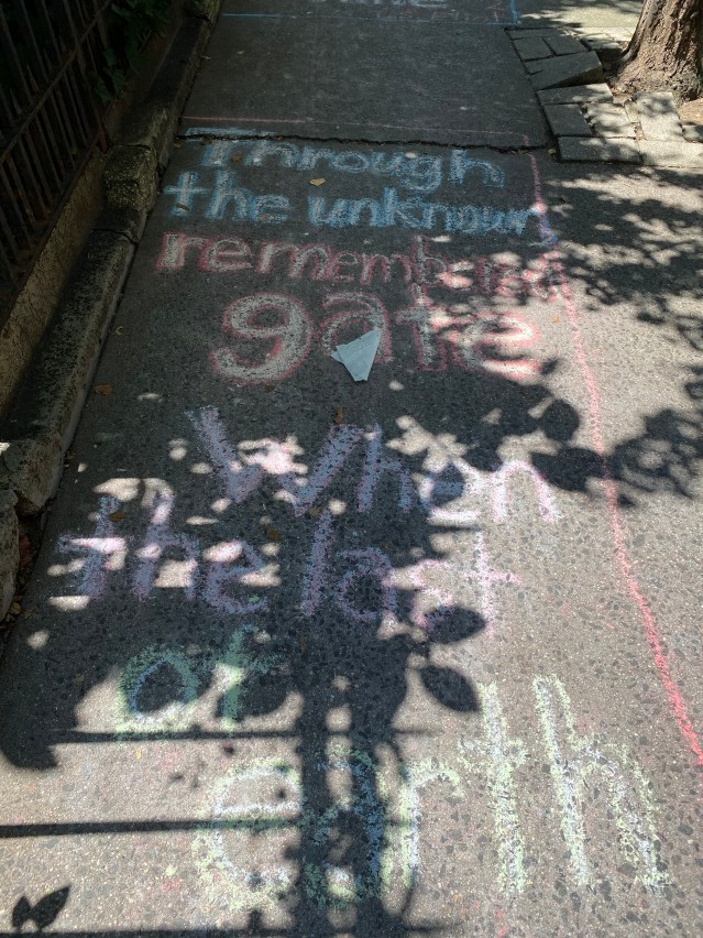 I feel the changes. They feel profound, even when my rational mind tries to tell me it’s just something whimsical, something quintessentially New York. It feels significant, for instance, to suddenly find a T.S. Eliot poem chalked onto the pavement in front of the 88th Street Episcopalian Church of The Holy Trinity. It appeared long after “poetry month” when it would have “made sense” without further context. And, unlike most of the currently burgeoning industry of ground-graffiti all over urban America, this one doesn’t a have an in-your-face message about revolutionary politics or race-relations or economic disparity or the police or Covid-19…. In other words, it’s not a sidewalk-chalk version of Twitter. Neither does the exact quote (about time and timelessness, righteousness, and love), strike me as overtly religious, though it is from a poem about God and salvation and it did choose to lay itself at the feet of a Church. And there is something beautiful about this pleasant scrawl of dusty pastels, watched over by a lush garden and a dazzling 19th century red-brick cathedral (a “national-registry-of historic-places” building). But it doesn’t fit anyone’s grand narrative about the epoch-defining changes that are happening in the city or the world.