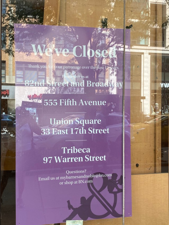 Strikingly, one of the “thank you/goodbye” messages adorns the once imposing Barnes & Noble, last of the “big box” mega-chain bookstores, which in their 1990s heyday were blamed for driving out the local, independent booksellers. All brick and mortar bookshops have struggled in the last couple of decades thanks to Amazon. Barnes & Noble was teetering for years, but somehow held on by offering in-person experiences, like reading spaces, children’s play areas and designer coffee and confections. The lockdown was the last straw.