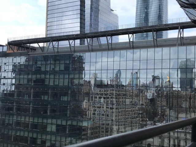 The panes of window glass reflect the interior of the room where I stand AND directly show the glass surface of the structure across the street, which in turn reflects back the structure containing the room where I stand.The windows reflect the street.The street (and part of a street fountain) reflects the windows.The wall reflects the drawbridge.